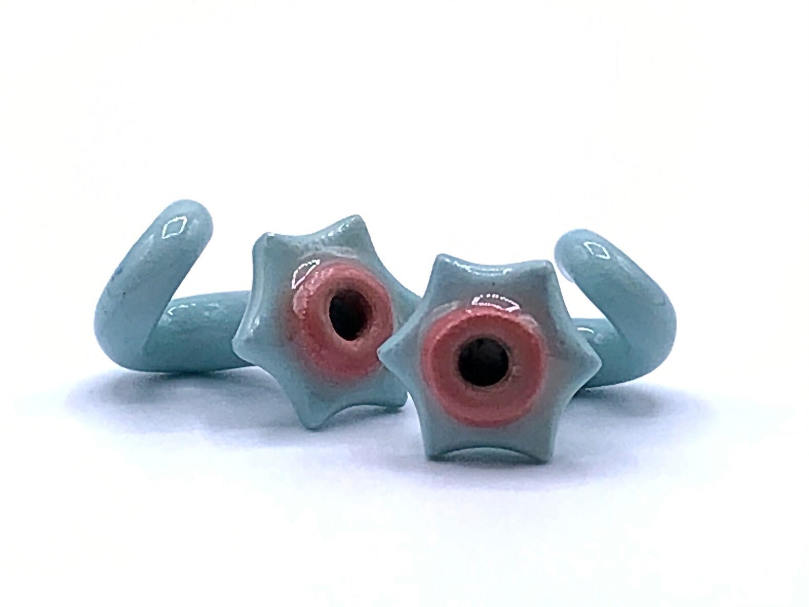 The earrings are handmade with pigment-colored stoneware, and ceramic glaze. The glaze is smooth, food-safe, and non-toxic- the same kind of glaze used on common household dishes and mugs.